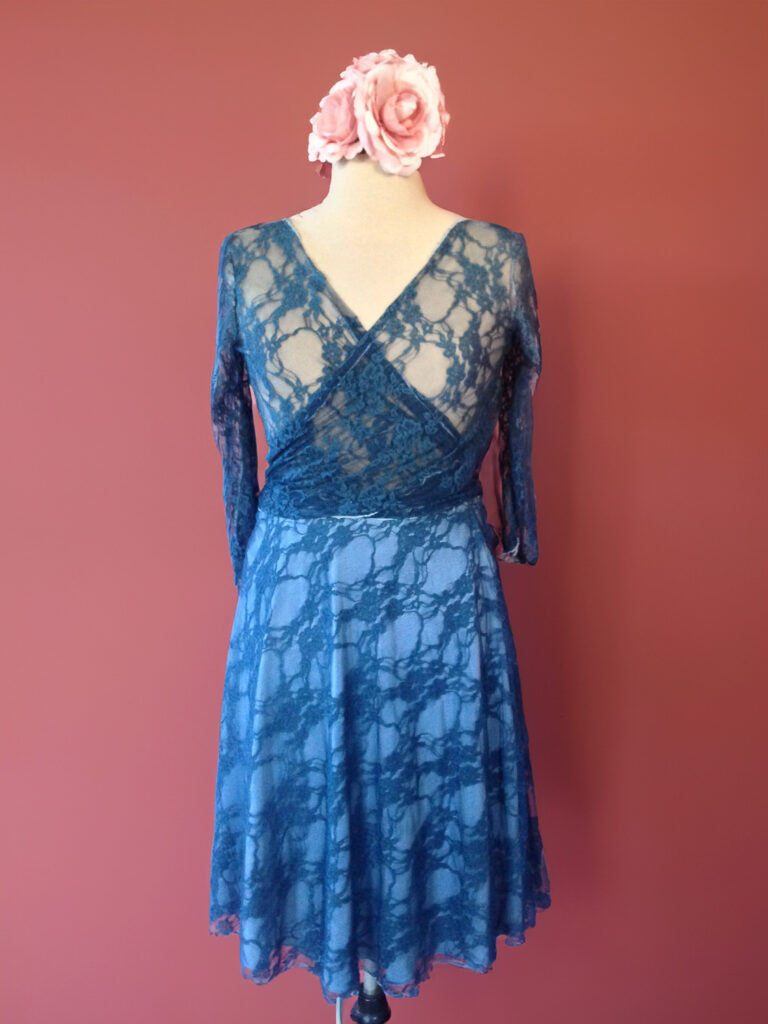 Daarna was het tijd voor een kleurverandering. De traditionele witte tint van trouwjurken is prachtig voor een bruiloft, maar niet altijd geschikt voor andere gelegenheden. We kozen voor een donkerblauwe kleur die perfect past bij Hanne’s stijl en die de jurk een heel nieuwe uitstraling gaf. Door de combinatie van de kortere lengte en de opvallende kleur ziet de jurk er fris en modern uit, zonder dat de oorspronkelijke charme verloren gaat.